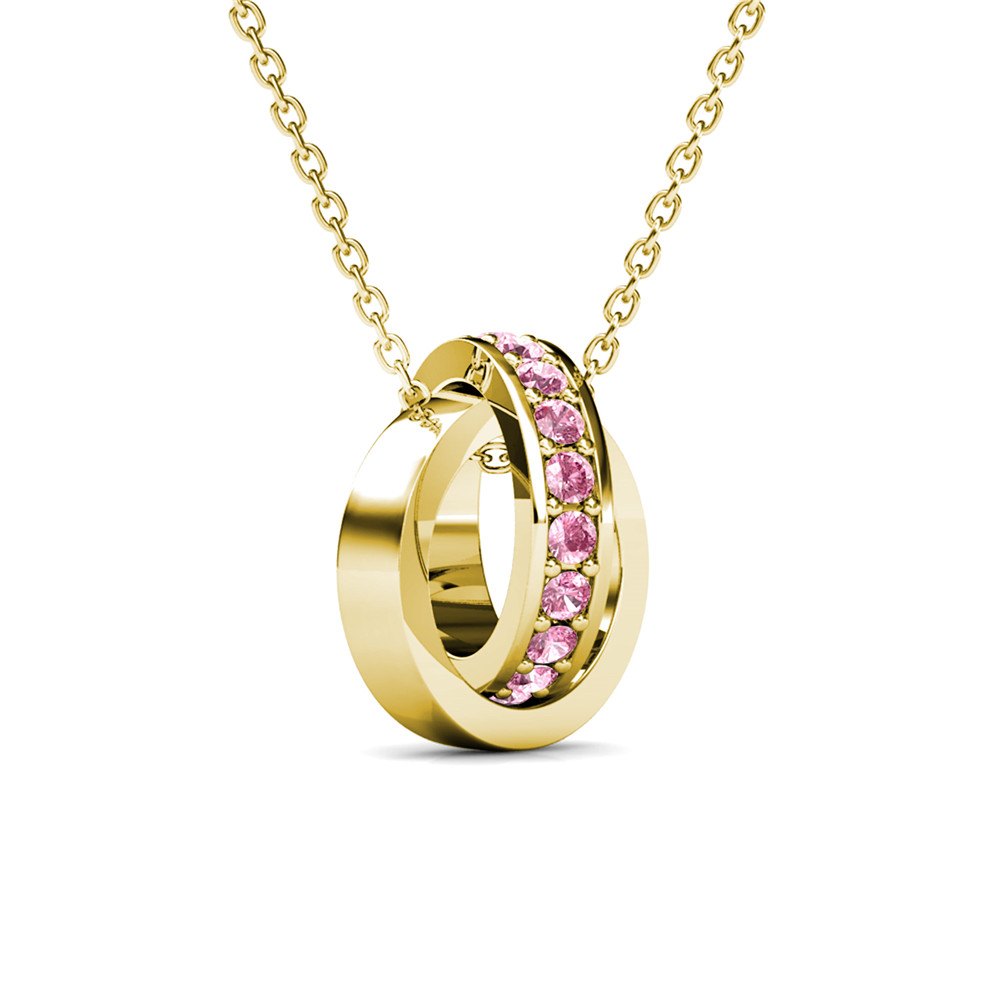 Elegantna verižica iz srebra, prevlečenega z 18-karatnim rumenim zlatom, s prepletom dveh krogov. En krog krasi 21 rožnatih Swarovski kristalov, ki dajejo nakitu igriv in čaroben lesk. Simbol povezanosti in ravnovesja, primeren za vsakdan ali posebne trenutke.